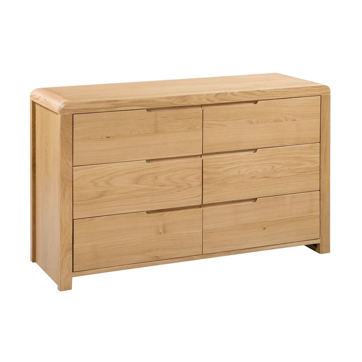 Dimensions H81 x W126 x D50 cmThe Curve 6 drawer wide chest is finished in oak and complimented in curves which provides sophistication and elegance. Features . Constructed from solid oak and oak veneersRecessed handles for a modern feelFeaturing 6 large drawers for hiding clutterPerfect for some extra storage and surface spaceMatching items availableNo assembly required. .
