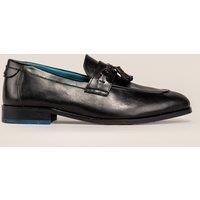 Elevate your style with the Emmet loafers. Made with premium leather and detailed with a sleek metal trim, these loafers exude sophistication and exclusivity. These luxury shoes are perfect for the office or a wedding and add a touch of elegance to any outfit. Step into luxury with the Emmet loafers for men. | Oswin Hyde Men's Emmet Leather Tassel Loafer in Black | Size: 8