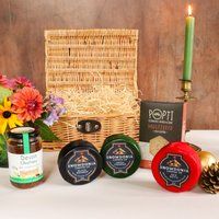 This delightful little hamper is just perfect for the festive season and contains a selection of 3 delicious, wax-wrapped cheeses and is accompanied by a locally made Devon Chutney and Cornish made crackers. A perfect Christmas gift for foodies and cheese lovers, sure to bring happiness and contenment this festive period. Contents: Black Bomber Extra Mature Cheddar 200g: a powerful but mellow cheddar with a creamy texture., Red Devil - Red Leicester with Crushed Chillies and Black Pepper : with an intense heat and depth of flavour., Green Thunder - Mature Cheddar with Garlic and Herbs: a strong and tangy cheddar with fresh garden herbs and a glorious punch of garlic., Popti Multi Seed Crackers: a rich, buttery cracker accented with a flavourful crunchy mix of seeds., Hogs Bottom Devon Chutney: a fruity chutney that is subtly flavoured with ginger, cloves and cinnamon with whole mustard seeds for a kick., 1 x Black Bomber Extra Mature Cheddar Cheese 200g, 1 ... - Manufacturers part number: Devon Hampers_1521-13
