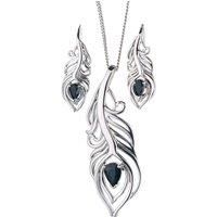 Elegant peacock feather statement pendant and matching dangle earrings each set with a pear shaped natural Australian inky blue sapphire. An Ojewellery design symbolising luck, positivity, strength, beauty and wealth. Sapphires are associated with purity and wisdom. They are the birthstone for September. This elegant pendant and earring set is suitable to wear for daytime or evening wear. Supplied with a 22 inch sterling silver chain with additional fixing loops at 18 and 20. The pendant, chain and earr...