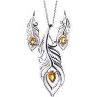 Elegant peacock feather statement pendant and matching dangle earrings each set with a pear shaped natural elegant vivid yellow citrine from Africa. An Ojewellery design symbolising luck, positivity, strength, beauty and wealth. Citrine are associated with joy and energy. They are the birthstone for November. This elegant set is suitable to wear for daytime or evening wear. Supplied with a 22 inch sterling silver chain with additional fixing loops at 18 and 20. The pendant, chain and earrings are finish...