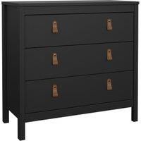 Barcelona Chest 3 Drawers In Matt Black A modern chest of drawers in a striking design complete with brown leather tab handles, also available in white Features: High quality laminated board (resistant to damage and scratches, moisture and high temperature) Made from PEFC Certified sustainable wood Easy self assembly Made in Denmark Easy gliding drawer runners Specifications: Dimensions: H:79.7 x W:82.1 x D:38.4 cm Colour: Black Guarantee: 1 Year Material: Melamine, Particleboard, Foil Model Number: 725... - Manufacturers part number: Furniture To Go_