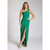 Featuring a striking asymmetric neckline and a front skirt split, this dress combines bold design with elegant flair. The rich emerald green hue adds a touch of opulence, making it perfect for formal occasions where you want to stand out. | Vesper Women's One Shoulder Maxi Dress with Thigh Split in Emerald | Size: 10