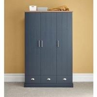 If you£d welcome a little more hanging space in your bedroom, this three-door wardrobe is a good option. Kendal£s country cottage-style feel adds a welcome touch of quality to any room, incorporating planked-style doors that open to reveal useful hanging space, accompanied by a handy trio of drawers beneath. The wardrobe is mounted on a deep base plinth and painted in a subtle shade of grey that tones with any colour scheme. The bevelled, oak-effect top and brushed steel handles complete the look. The K...