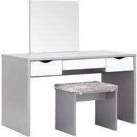 Treat yourself to a dressing table set thats compact and contemporary in design ideal for a bedroom where space is at a premium. The simple console style table has a painted finish, with a trio of drawers in a contrasting shade each featuring cut out handles. The table top has ample space for ornaments and decorative accessories, and there's a fixed frameless mirror at the back. The matching stool has a removable padded cushion in a plush cover and is designed to slip under the table when not in use. ...