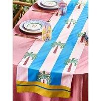 Eleanor Bowmer Electric Coast Palm Tree Table Runner The Electric Coast collection from Eleanor Bowmer takes its inspiration from the sun-drenched aesthetics of America’s West Coast. Summery palettes pair with bold prints to build an incredible look based on endless summer days. A key part of the range, the Palm Tree Table Runner features hand-painted palm tree motifs set against a blue and pale pink striped canvas. It’s finished with gorgeous golden ends for a sunny look that’s easy t...