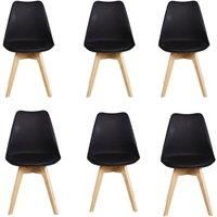 Our retro chairs combine Scandinavian minimalist style with everyday comfort, creating the perfect blend of chic design and practicality. Featuring an ergonomically molded polypropylene shell, these chairs offer superior back support for long-lasting comfort. The padded faux leather seat adds an extra layer of relaxation, while the gently curved backrest provides a body-friendly fit. Built with solid wood legs, these chairs offer exceptional stability and durability, while the smooth waterfall edge and protective foot pads ensure your floors remain scratch-free. Designed to seamlessly complement dining rooms, home offices, and modern living spaces, these versatile chairs bring a timeless elegance to any home. With superior craftsmanship and enduring style, they are an ideal choice for those seeking both function and fashion in their furniture. | Life Interiors Set of 6 'Tulip Dining Chairs' Leather Padded Seat Solid Wood Legs in Black - Manufacturers part number: Life Interiors_5060734515626