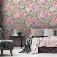 The Muriva Fayre floral wallpaper in pink and grey is a classic design sure to add a stylish finish to your home. Featuring large magnificent hand painted floral trail in soft tones of pink, cream and green all set on a pale grey background with a lightly textured fabric finish. This gorgeous wallpaper is incredibly versatile and ideal for creating feature walls or to decorate entire rooms.