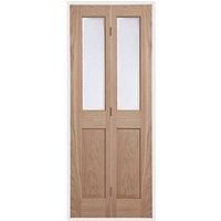 Distinctive, classic style in a bifold format to create open-plan space. Features frosted toughened safety glass panels with a clear edge. Supplied with all the hardware required to fit a folding door into an existing standard opening. Top track with sliding guide combined with 2 pivot points will action the folding doors. 5mm can be taken from the outside stile only. Supplied unfinished. Required Opening W x D x H: 766 x 35 x 1985mm American White Oak Veneer over Particle Board Construction 2000mm Alum... - Manufacturers part number: 104FA