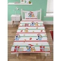 Bluey Christmas Single Duvet Cover and Pillowcase Set Featuring everyone’s favourite family of pups getting ready for the most wonderful time of the year, this delightful duvet cover and pillowcase set brings a little bit of Bluey to your child’s sleep space. The super fun design sees Bluey and Bingo getting up to lots of Christmas mischief against a red, white and green striped backdrop. Flipping it over will reveal an alternative print, so kids can choose their favourite look any time they...