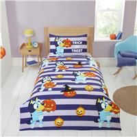 Its time to get spooky with this officially licensed Trick or Treat, Bluey Halloween themed single duvet set. The front side features Bluey on a striped ground surrounded by pumpkins, the other has Bingo dressed as a witch with bats & the word Boo. Set comprises of 1 duvet cover and 1 pillowcase. Blue and green. Size L200 x W135cm.Pillow case length 75cm, Width 50cm. Standard pillowcase (s). Reversible pillowcase (s). Reversible. Poppers for fastening. Machine washable at 30C. Suitable for tumble drying...
