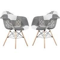 Our eye-catching Dining Tub Chair's unique patchwork design blends elegance with a retro vibe, featuring geometric patterns that add personality and character to any space. Beyond its striking appearance, the tub-style chair offers exceptional comfort and support with its well-crafted armrests, providing a refined seating experience. Constructed from premium quality materials, it ensures durability for daily use, while solid wooden legs provide stability and longevity. Perfect for homes, apartments, or offices, this affordable designer chair combines style and practicality without compromising on comfort or quality. | Life Interiors Set of 2 Patchwork Accent Chairs with Wooden Legs & Black Metal Wire Frame - Manufacturers part number: Life Interiors_5060847952929