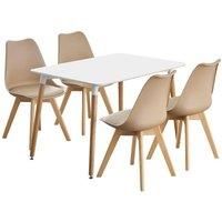 The highly recommended Scandinavian style Lorenzo dinette set includes a modern dining table and dining chairs set of 4. The padded kitchen set will match any room due to its classic design and will give a sophisticated touch to your furniture. The sturdy wooden table and kitchen chairs with padded faux leather seats offer a comfortable sitting experience. The legs feet are covered with end caps that protect your floor from scratching, in the meantime make this dinette set anti-slip, anti-noise and enhance its stability. Perfect for kitchen storage, dining rooms, living rooms, and many more. Hence, offers a practical and modern seating solution to your home and living space. | Life Interiors 5 Pieces Dining Set - a Halo Dining Table & Set of 4 Lorenzo Tulip chairs with Padded Seat in Beige