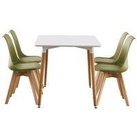 The highly recommended Scandinavian style Lorenzo dinette set includes a modern dining table and dining chairs set of 4. The padded kitchen set will match any room due to its classic design and will give a sophisticated touch to your furniture. The sturdy wooden table and kitchen chairs with padded faux leather seats offer a comfortable sitting experience. The legs feet are covered with end caps that protect your floor from scratching, in the meantime make this dinette set anti-slip, anti-noise and enhance its stability. Perfect for kitchen storage, dining rooms, living rooms, and many more. Hence, offers a practical and modern seating solution to your home and living space. | Life Interiors 5 Pieces Dining Set - a Halo Dining Table & Set of 4 Lorenzo Tulip chairs with Padded Seat in Green