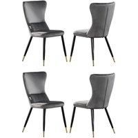 Inspired by timeless Scandinavian design, this modern velvet dining chair features a gracefully curved high back, generously padded seat, and supportive upholstered arms for maximum comfort during extended use. The rich, luxurious velvet adds a sophisticated touch, while the sleek black legs with elegant gold tips offer a striking contrast that complements any dcor. Built for both style and durability, the chair includes adjustable feet for added stability on uneven surfaces, solving common pain points like discomfort and wobbling. Whether used as a dining chair, office seat, or accent piece in your living room, dressing room, or restaurant, it delivers ergonomic support, relieves pressure on the back and legs, and ensures you stay comfortable without stiffness. A perfect blend of elegance and function, this chair brings lasting comfort and refined style to any space. | Life Interiors Set of 4 New York Modern Velvet Dining Chairs with High Back, Black Metal Legs, & Gold Tips in Grey - Manufacturers part number: Life Interiors_5060847959638