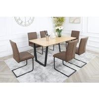 Introducing our 4 or 6 seater oak dining set, a practical and stylish addition to your dining space that seamlessly marries functionality with industrial design. This dining set comprises a robust oak dining table and rugged industrial chairs, creating a versatile ensemble that emanates quality and contemporary charm, designed to elevate your dining experience. The centrepiece of this dining set is the MDF tabletop with a paper finish oak dining table, meticulously crafted from premium oak wood, with st...