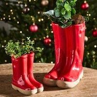 Made from durable stoneware with a high gloss treacle glaze finish in bottle red, each plant pot is complete with relief "buckle" detailing. Featuring a natural chunky sole with a rough grain finish for a contrasting texture, the grip underneath will keep the boots firmly in place wherever displayed. | Dibor Set of 2 Small & Large Red Wellington Boots Ceramic Indoor Outdoor Flower Pot Garden Planter Pots