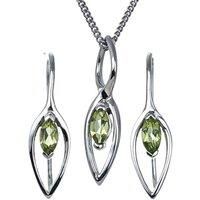 Elegant peridot jewellery set. Marquise cut peridot set in an infinity loop drop pendant made of sterling silver and matching green dangle earrings. The natural green peridot is from Arizona USA. Each stone measures 6 x 3mm giving an approximately 0.72ct stone weight Peridot are associated with harmony, peace and compassion. They are the birthstone for August. This elegant pendant is suitable to wear for daytime or evening wear. Finished with a commercial grade rhodium plate to give a high quality shine...