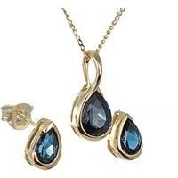 Elegant 9ct Gold solitaire pear African London Blue Topaz pendant and matching earrings. Ojewellery design and part of our first full gold collection. Produced in very small quantities you will only find this pendant from Ojewellery direct. Set in a raised rub over setting made of 9ct yellow gold to allow light to the back of the stone and show off its natural sparkle. The stone measures 7x5 mm Blue Topaz are associated with faithfulness and good fortune. They are the birthstone for December. This elega...