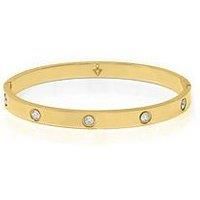 This simple yet stylish piece is perfect as a little keepsake. With a choice of silver or yellow gold, our Silver Hinged Stone Bangle features cubic zirconia stones across an oval-shaped bracelet. It is hinged and easily clicks shut