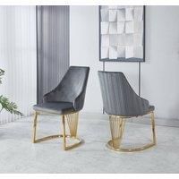 New Model Velvet, High Back Stunning Soft Padding Dining Chairs with Golden Chrome Legs. Available in 3 different colours Black Grey and Cream (beige). This is one of our Velvet Popular Range Updated Version with Studs and Knocker at the Back. Thick Cushion padded Dining Chairs in Black Brown Grey and Cream Available for Immediate Dispatch. Product Dimensions: Approximately Total Height= 108 cm Seat Height= 50 cm Width = 44 cm Leg Space= 55 cm (front to back) Leg Space= 41 cm (side to side front) Seat Width / Depth= 44 cm Note: Self Assembling Required, where 4 legs need to be attached with the main body part along with provided hardware fittings & Tools. If you may need further information, do let us know | Modernique Set of 2 Velvet Upholstered Dining Chairs with Golden Metal Legs in Grey - Manufacturers part number: Modernique_5061017321781