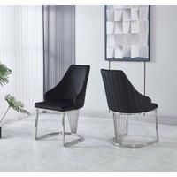 Set of 2 Chrome Frame Velvet in Black & Grey Dining Chairs Elevate your Kitchen dining space with these exquisite chairs that seamlessly blend modern elegance and timeless sophistication. Crafted with meticulous attention to detail, these chairs feature a sleek, streamlined design with a plush upholstered seat and backrest, providing unparalleled comfort and support. The striking contrast between the warm beige and crisp white hues creates a visually captivating aesthetic, while the Silver-toned metal frame lends a touch of opulence. Whether you're hosting a gathering or simply seeking a cosy retreat, these chairs will effortlessly complement your decor, adding a touch of refined luxury to your interior. With their exceptional craftsmanship and versatile style, these chairs are a true investment in elevated living. | Modernique Set of 2 Velvet Upholstered Dining Chairs with Chrome Metal Legs in Black - Manufacturers part number: Modernique_5061017321804