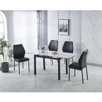 Transform your dining space with this sophisticated Sintere stone-effect dining set. The sleek glass top table features an extending mechanism, making it perfect for both everyday meals and entertaining guests. The table's stone-effect finish adds a touch of luxury while maintaining a contemporary aesthetic. Accompanied by four elegant black chairs with ergonomic designs, this set combines style with comfort. The chairs feature durable metal frames and high-quality upholstery that complements the table's modern design. The set's minimalist appearance is enhanced by clean lines and a monochromatic colour scheme, making it a versatile addition to any modern interior. Perfect for urban homes and apartments, this dining set creates an inviting atmosphere for family meals and social gatherings. The table's glass surface is easy to clean and maintain, while the chairs provide comfortable seating for extended dining experiences. | Modernique Sintere Stone Top Extending Table & 4 Faux Leather ... - Manufacturers part numbers: 5pcdiningset-sutton|Modernique_5061017322184