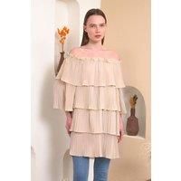Crafted from viscose, this blouse offers both comfort and style. The relaxed fit and off shoulder provide a laid-back vibe, while the layered design adds an element of elegance. Perfect for any occasion, from casual outings to special events, this versatile piece is a wardrobe essential. | HOXTON GAL Women's Oversized Off-Shoulder Pleated Layered Detailed Blouse in Beige - Manufacturers part number: HOXTON GAL_5061023268605