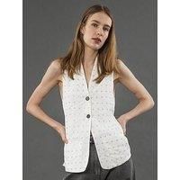 Religion Fleet Sequin Beaded Waistcoat Top - White Introducing the Fleet waistcoat, a statement piece that effortlessly combines sophistication with flair. Crafted from luxurious crepe, this black waistcoat exudes elegance, with intricate sequin detailing adorning the front. The flowing georgette back adds a touch of drama, revealing a subtle see-through effect that adds intrigue to your ensemble. Featuring a back strap for added structure and a comfortable fit, this sleeveless waistcoat sits at hip len...