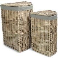 Set of 2 Antique Wash Corner Linen Basket with Grey Sage Lining. Full antique wash finish willow with cream faux leather straps and a removable cotton/polyester lining with integral handles. Antique Wash Willow. Integral handles Faux Lether Straps Hinges. Manufactured from sustainable materials. Colours and finish could vary. Size Small Depth 33 x Height 50 x Width 33cm Weight 1.6kg Large Depth 46 x Height 60 x Width 46cm Weight 2.2kg
