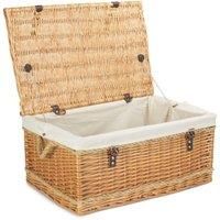 Full buff willow with real leather straps and rope handles and a removable cotton lining. Attractive looking . High Quality, Well made Basketware. Natural product so dimensions can vary slightly. Manufactured from sustainable materials. Colours and finish could vary. Size Depth 400 x Height 290 x Width 620 Weight 3kg Material Wicker - Manufacturers part number: EH003W