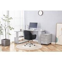 Kosy Koala modern office furniture set, designed to combine style, functionality, and comfort. This set includes a sleek grey L-shaped desk, a black velvet-upholstered office chair, and a mobile storage drawer unit. The desk features a durable wooden top with storage shelves. The chair comes with elegant diamond stitching. The chair offers height adjustment and smooth caster wheels for easy mobility and comfort. For added convenience, this set also includes a mobile storage drawer unit, which fits easil...