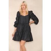 elaina fashion Women/'s Black Frill Pleated Cotton Mini Dress - Spring Summer Casual Loose Short Dress with Ruched Puff 3/4 Long Sleeve, Front Button (UK, Numeric, 24, Regular, Regular, Black)