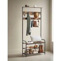 This multifunctional hallway coat rack offers a perfect combination of style and practicality. Featuring a sturdy steel frame and durable particleboard panels, it provides ample space to hang coats, bags, and accessories while also functioning as a comfortable bench for changing shoes. The rustic brown and black colour scheme adds an industrial charm that fits seamlessly into modern and classic interiors alike. Designed to keep your space tidy and organised, this coat rack is ideal for entryways, hallwa...