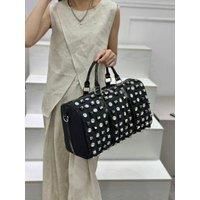 This stunning black duffle handbag is adorned with an array of sparkling crystals and edgy metallic studs, creating a captivating design that's sure to turn heads. Perfect for making a statement, whether you're heading out for the evening or adding a bold touch to your daily look. Features a spacious interior, comfortable top handles, and durable construction for everyday chic. | PEACH ACCESSORIES Women's Sparkle & Edge Studded Duffle Bag in Black
