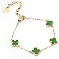 Say It With Green Crystal Clover Bracelet - Yellow Gold Bring effortless elegance to your look with the Green Crystal Clover Bracelet in Yellow Gold. Expertly crafted from stainless steel and plated in radiant yellow gold, this bracelet showcases a delicate clover charm, highlighted by a vibrant green crystal that catches the light with every movement. Designed for both comfort and versatility, it measures 6.5 inches with a 1-inch extension, ensuring a perfect adjustable fit. The warm yellow gold finish...