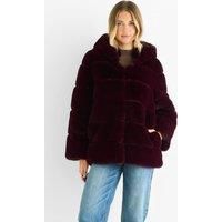 This Dark Burgundy Horizontal Cut Fur Hooded Jacket offers a bold and stylish look with its rich color and unique horizontal cut design. The soft fur-lined hood adds a layer of cozy comfort, making it perfect for casual wear on cooler days. Stay warm and confident with this comfortable, eye-catching jacket. | Gini London Women's Dark Burgundy Horizontal Cut Fur Hooded Jacket | Size: Small/Medium - Manufacturers part number: Gini London_5061094584918