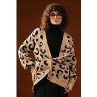 Crafted from a soft and warm acrylic knit, this cardigan promises a comfortable feel against your skin, perfect for cooler days. It features a striking all-over leopard print in a classic combination of tan/beige and black, ensuring you turn heads wherever you go. The timeless V-neckline offers a flattering cut, while the prominent button-front closure with complementary buttons adds a touch of traditional cardigan charm. Material: Acrylic Knit for softness and warmth. Pattern: All-over Leopard Print in...