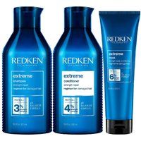 Set includes:- Redken Extreme Shampoo 500ml:One of Redken's best-selling products, this hair strengthening shampoo cleanses, strengthens and fortifies weakened areas. Additionally, it restores and repairs damaged hair while protecting hair's natural shine. Using the full system with Extreme's Shampoo, Conditioner and Anti-Snap will help your hair to have a 73% decrease in breakage and become 3x stronger. To use: Apply as much as needed and gently massage until lathers. Rinse. Followed by Conditioner.- Redken Extreme Conditioner 500ml:One of Redken's best-selling products for damaged hair, this hair strengthening conditioner protects shine, repairs your hair and leaves it supple and shiny. A smart, targeted delivery system treats hair from the root to the core to the tip, giving all 3 levels the custom nourishment they need. To use: After shampooing, apply and distribute through hair. Rinse.- Redken Extreme Mask 250ml:This strengthening hair mask conditions and helps repair hair whilst ... - Manufacturers part number: Redken_5061111411739