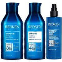 Set includes:- Redken Extreme Shampoo 500ml:One of Redken's best-selling products, this hair strengthening shampoo cleanses, strengthens and fortifies weakened areas. Additionally, it restores and repairs damaged hair while protecting hair's natural shine. Using the full system with Extreme's Shampoo, Conditioner and Anti-Snap will help your hair to have a 73% decrease in breakage and become 3x stronger. To use: Apply as much as needed and gently massage until lathers. Rinse. Followed by Conditioner.- Redken Extreme Conditioner 500ml:One of Redken's best-selling products for damaged hair, this hair strengthening conditioner protects shine, repairs your hair and leaves it supple and shiny. A smart, targeted delivery system treats hair from the root to the core to the tip, giving all 3 levels the custom nourishment they need. To use: After shampooing, apply and distribute through hair. Rinse.- Redken Extreme Anti-Snap Treatment Spray for Damaged Hair, Helps Prevent Breakage 250mlSmoothen... - Manufacturers part number: Redken_5061111411746