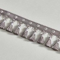 * Spot Tassel Fringe Grey Trim* 10m Bundle* Classic design with delicate tassels* Spot detailing Featuring a classic design with delicate tassels and spot detailing, this textured fringe is crafted from a viscose and polyester blend in a light grey colour. Because our fabric by the metre is cut to the size you require, we can only accept returns if the item is faulty (i. e. damaged or marked). - Manufacturers part number: 30821970