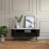 * Mango wood construction* Marble top* Trendy slatted front* Storage cupboard* Contemporary, rounded design Get ready for movie nights with our Kiera TV Unit! Made with sturdy mango wood and featuring a sleek marble top, this unit is perfect for your living room. With its trendy slatted front and ample storage space, you can keep all your favorite DV Ds and electronics in one convenient place. Please note we are unable to deliver this item to Northern Ireland. - Manufacturers part number: 30839428