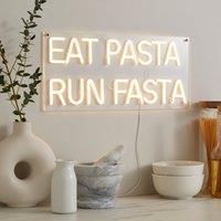 * Typographic Design* Emits Warm White Glow* Included USB Cable This quirky typographic neon wall light features the fun phrase Eat Pasta Run Fasta. It emits a warm white glow and is easy to install with two wall attachment holes, plus it includes a USB cable for hassle-free setup. Please note that this product only comes with a USB cable and doesn't include a plug adaptor. - Manufacturers part number: 30901683