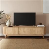* Wooden frame* Internal shelves for storage* 3 cable holes* Can be wall mounted Combining style with functionality, this extra-wide TV unit features a sleek design with sturdy legs, creating a modern and balanced look. The internal shelf provides space for media equipment, while three cable holes at the back help keep wires neatly hidden. The wooden effect finish brings warmth and character, making this TV stand a stylish centrepiece for any entertainment space. - Manufacturers part number: 30927345