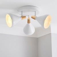 * Bulb required: 3 x 6W SES (Small Edison Screw) - E14 Round* Bulb not included* Dimmable compatible* Adjustable shades* Available in other colours* Perfect for kids bedrooms Offering a fresh contemporary design, the Wolston 3 light spotlight is perfect for giving your home a light, scandi feel. Perfect for any space, this stylish fitting features three adjustable white conical shades, complete with light wood effect toppers for a natural touch. - Manufacturers part number: 30948846