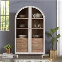 * Mango wood frame* 2 glass doors* Extra storage in drawers Inspired by a cabinet of curiosities, this cabinet combines beauty and functionality. Made from mango wood with a white-wash finish, this display cabinet features two glass doors, spacious double shelving, and three drawers for extra storage. Please note we are unable to deliver this item to Northern Ireland. - Manufacturers part number: 30965891