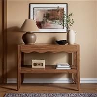 * Modern console table* Wiggle design* Wooden effect finish Make a bold first impression with the Jovie console table, a striking piece that brings sculptural flair to your hallway or living space. Featuring a distinctive wiggle design, this console table is more than just a surface, its a statement. The walnut effect finish adds a rich, organic feel, while a hidden drawer offers discreet storage for keys, post, or other small items. - Manufacturers part number: 30972207