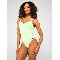 Nike Womens V Neck One Piece Swimsuit - Yellow This essential just got a modern upgrade with our newest v-neck style. Meant to accentuate every body, it features adjustable back and shoulder straps for a completely custom fit. Medium support and standard bottom coverage offers everything you need to have fun by the water all day, every day. Material Content: 87% Polyester, 13% Elastane Washing Instructions: Machine Washable