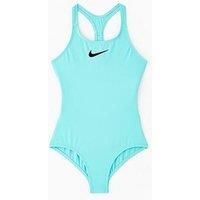 Nike Girls Racerback One Piece Swimsuit Size & Fit Available in sizes XS - XL Details Girls Racerback One Piece Swimsuit by Nike Blue One piece deign Racerback style Scoop neck Quick-drying fabric Swoosh design Material & Care Material Content: 100%polyester