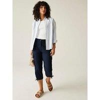 Regatta Womens Shorebellacapri Cargo Capri Trousers Size & Fit True to size - order your usual size Available in sizes 8 - 20 Details Womens Shorebellacapri Cargo Capri Trousers by Regatta Navy Trousers 6 pockets Material & Care Material Content: 56% Viscose; 40% Cotton; 4% Elastane Washing Instructions: Machine Washable - Manufacturers part number: RWJ322